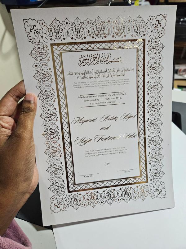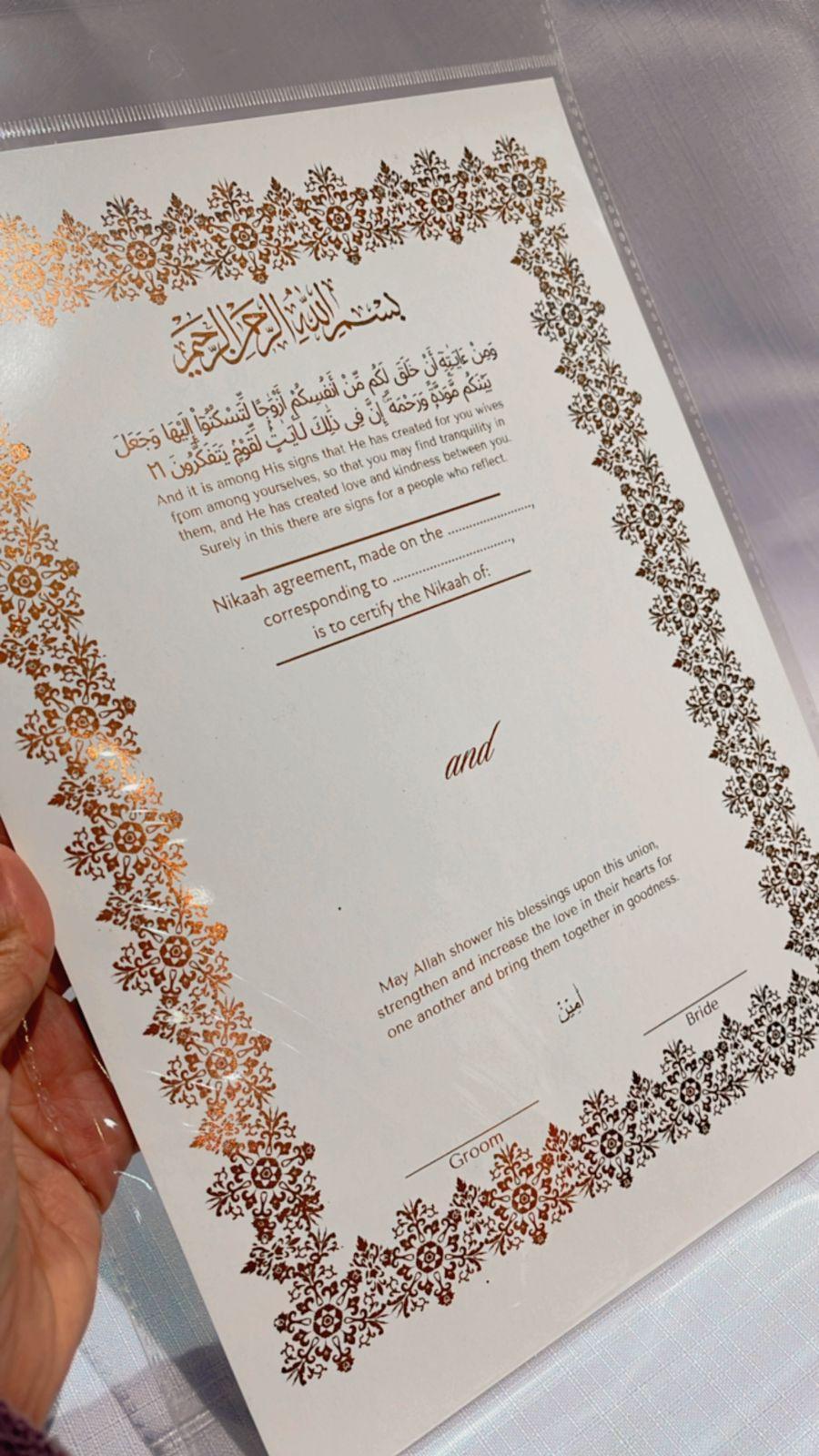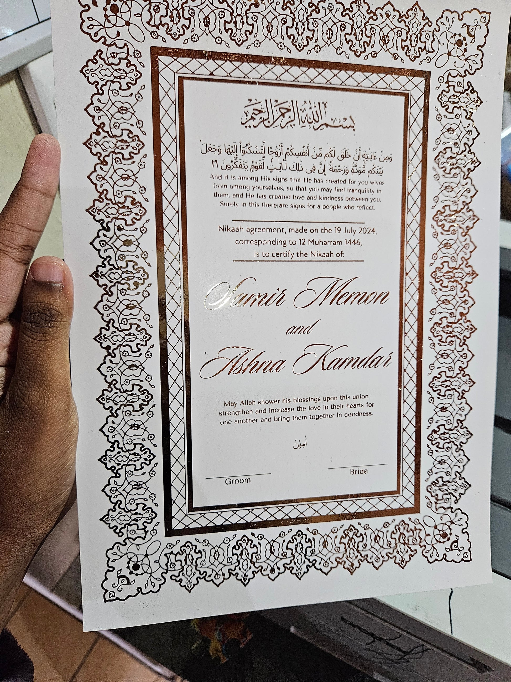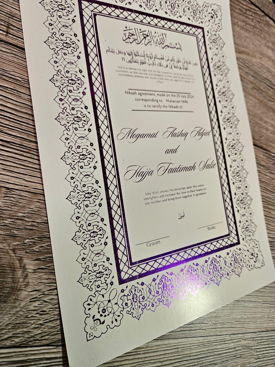These Nikaah Certificates exude elegance printed on high quality 300gsm cardstock and foiled.