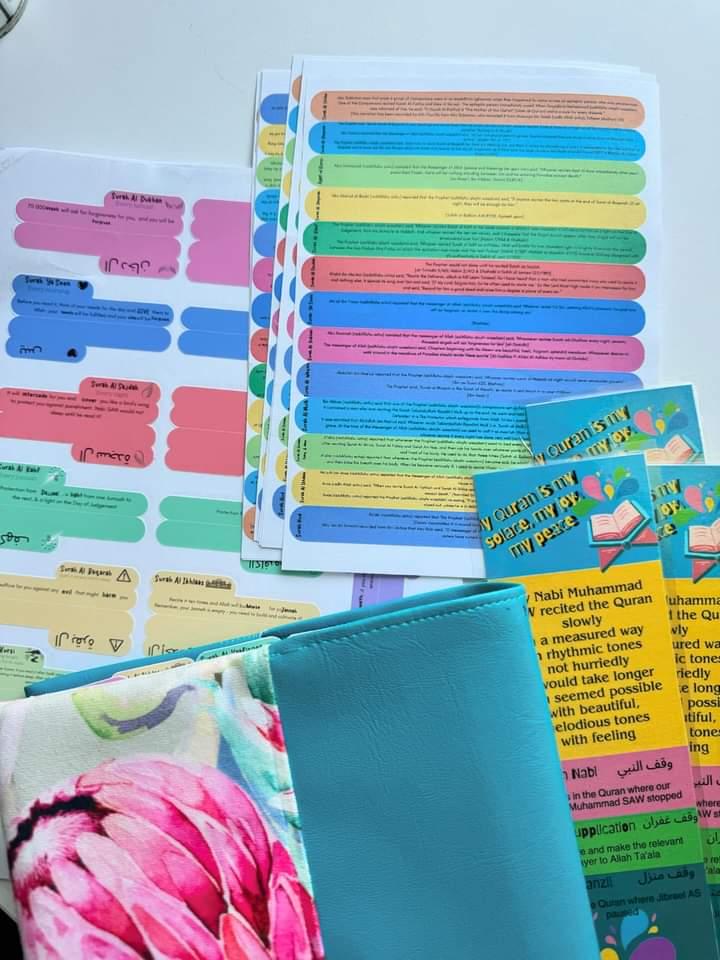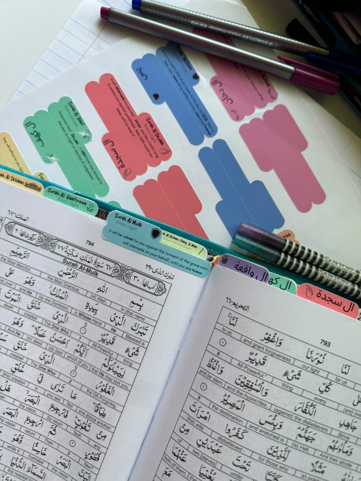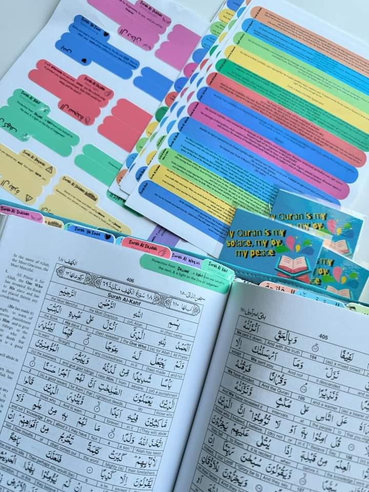 Tag your quraan with these sticker tabs. Each tab has the Surah and the virtue for reading the Surah.