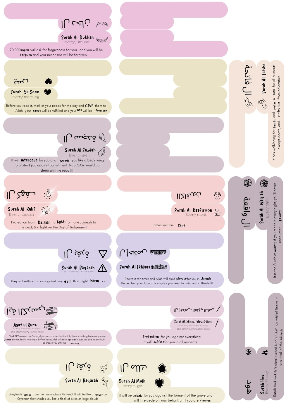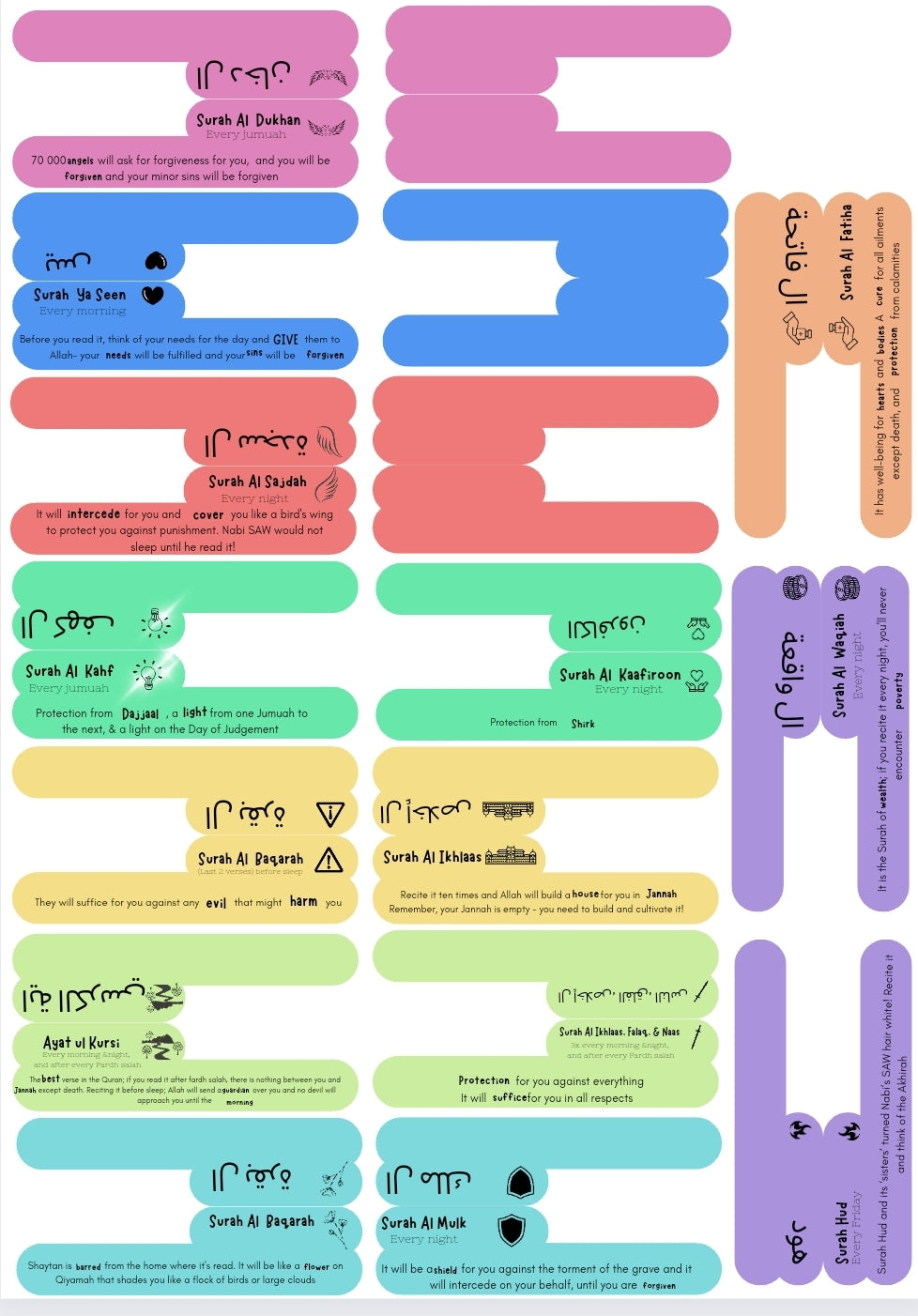 - 1x A5 laminated sheet to slot in the front or back of your quraan with the full hadith and virtues for each of the surahs.