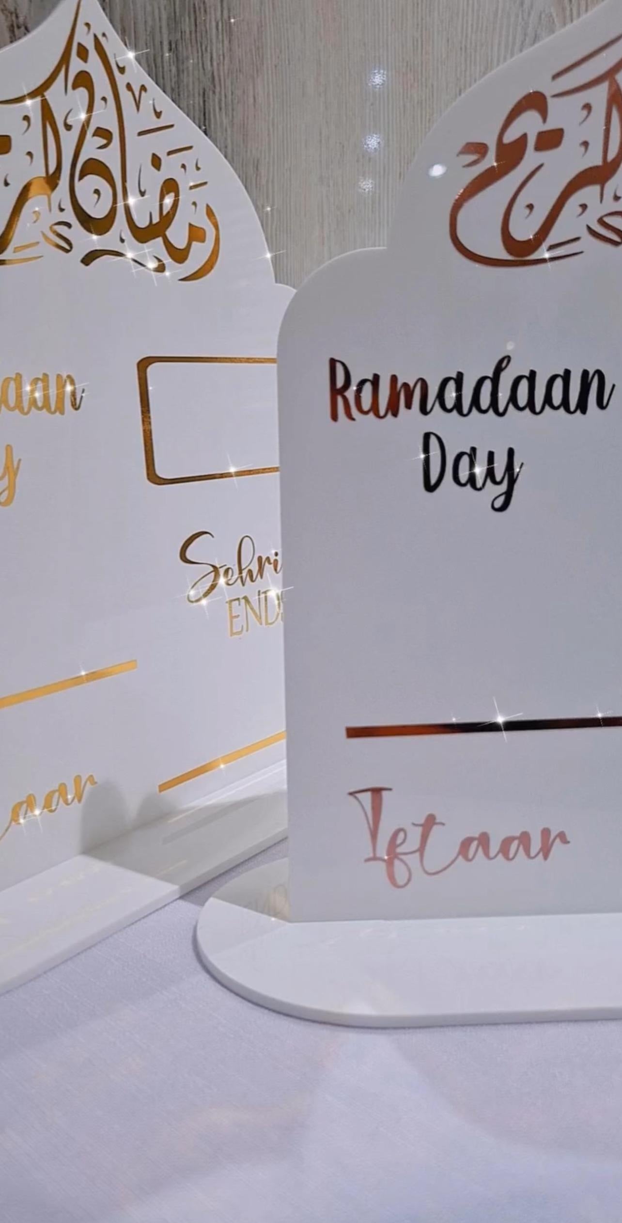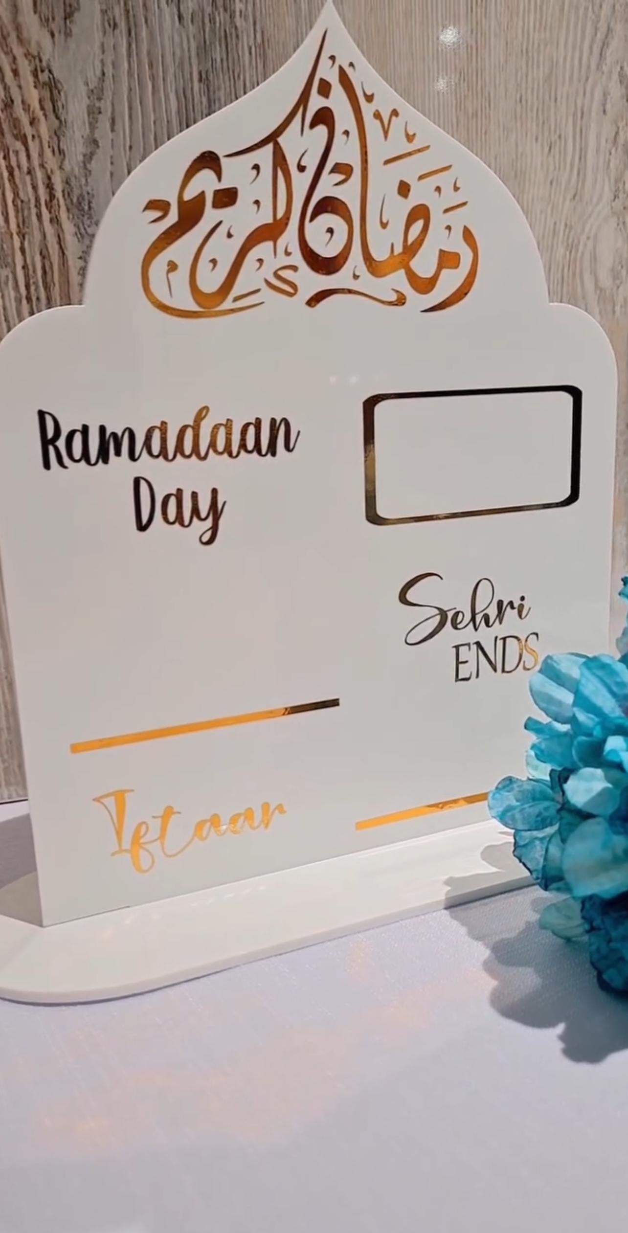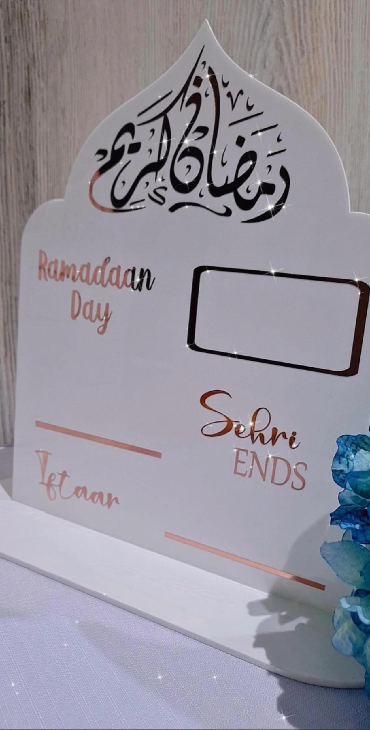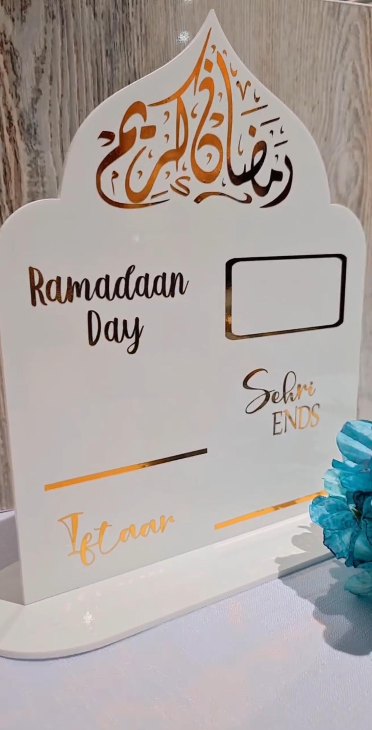 Keep track of your daily Ramadan schedule with our stylish and functional acrylic boards. Designed with elegance and practicality in mind, these reusable boards allow you to write and update important details like the day of Ramadan, sehri end time, and iftar time with ease. Perfect for homes, mosques, or offices, our boards are crafted from high-quality acrylic that’s durable, easy to clean, and visually appealing. Stay organized and enhance the spiritual atmosphere of Ramadan with this thoughtful addition to your daily routine.