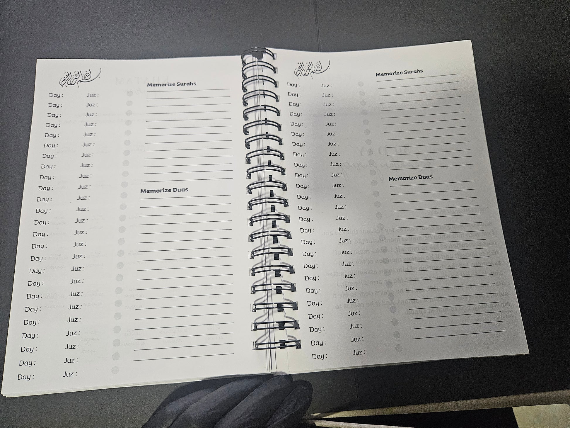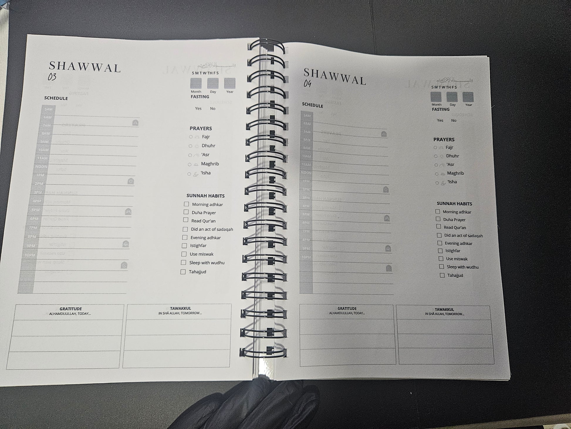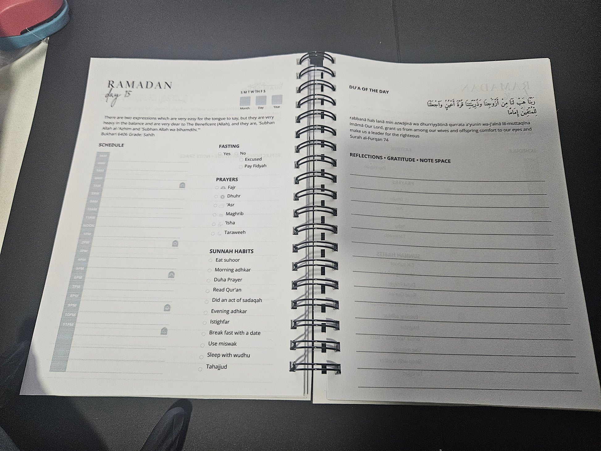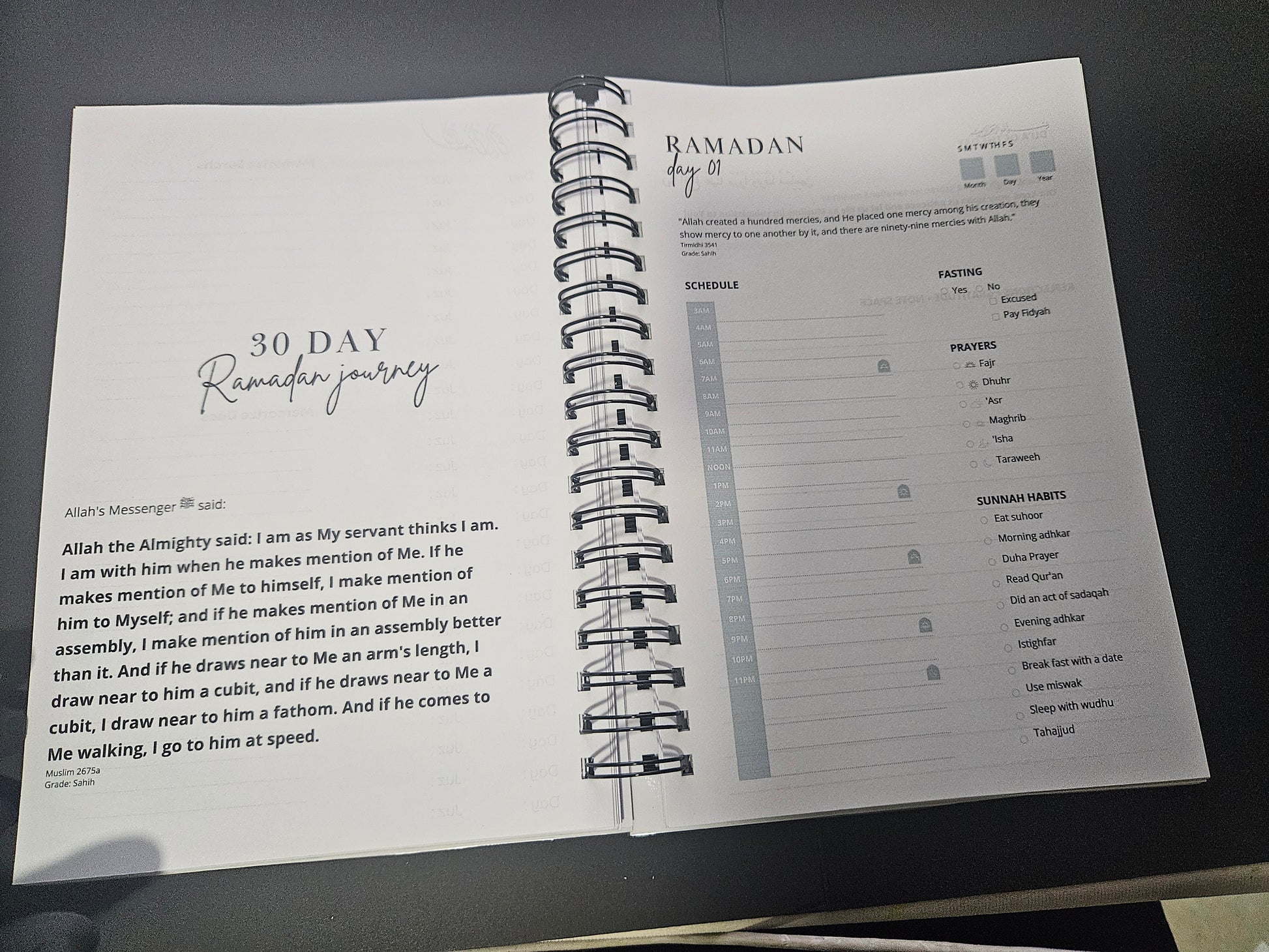 - 30 day Ramadan planner includes a section for your daily schedule, habits, prayers, a dua/hadith a day a section for reflections, gratitude or notes.